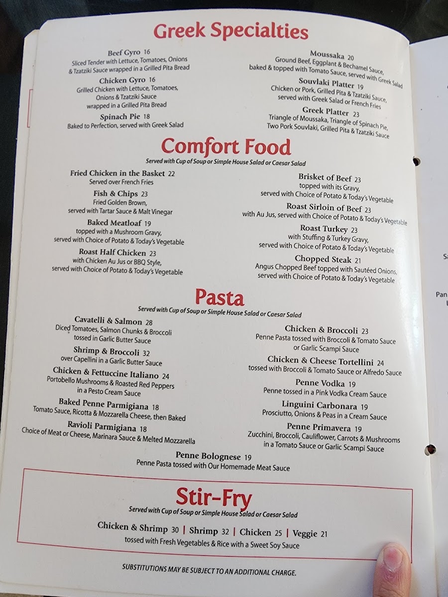 The all-day breakfast selections are a highlight, featuring fluffy pancakes, seasoned omelets, and crispy bacon. For lunch and dinner, you can choose from hearty burgers, fresh salads, and daily specials like the Cavatelli and Salmon paired with a delightful soup. The kid-friendly menu ensures that even the youngest diners are well catered for.